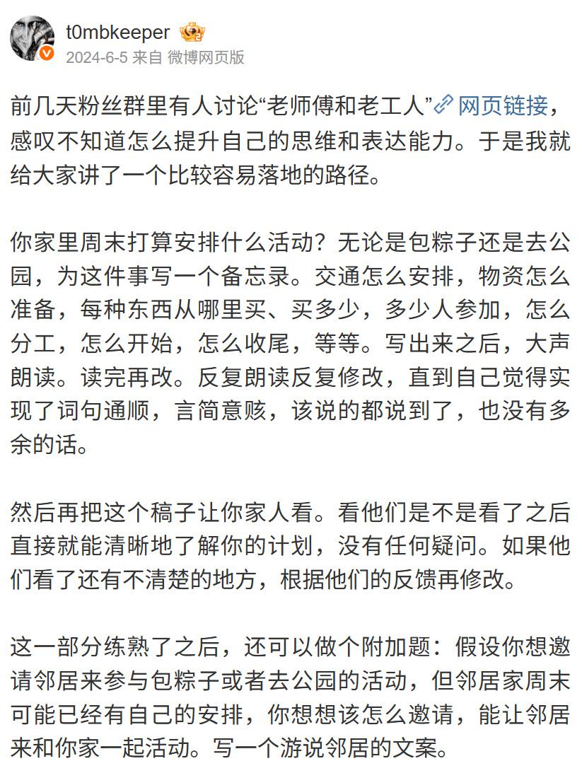 2. 重要场合如果可以提前准备发言稿的,先对着镜子练习,然后对着家人练习,这两关过不了其他场面表现也好不到哪里去; 3. 少用 AI 润色,尽可能自己完善文稿,这是 AI 无法取代的环节,拿一篇别人的演讲稿是练不好的。线下面对面短兵相接,谁菜一目了然; 演讲和写作一样,都是一种技能,需要锻炼。练习可以帮助你掌握这些技能。 另外,单纯的背诵是一种无效的演讲技巧,只要出现一点失误,会像多米诺效应一样影响整体。 |