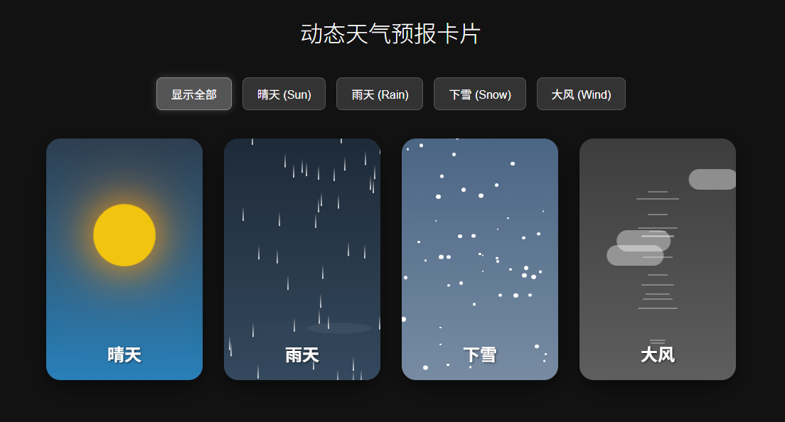 创建一个包含 CSS 和 JavaScript 的单一 HTML 文件,用于生成动画天气卡片。卡片应该通过不同的动画直观地表示以下天气状况:
