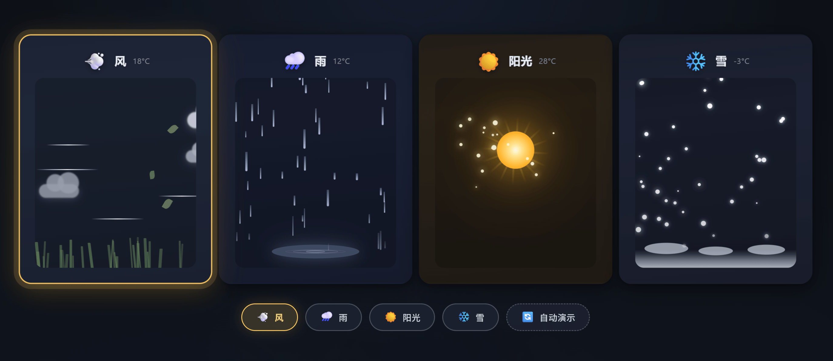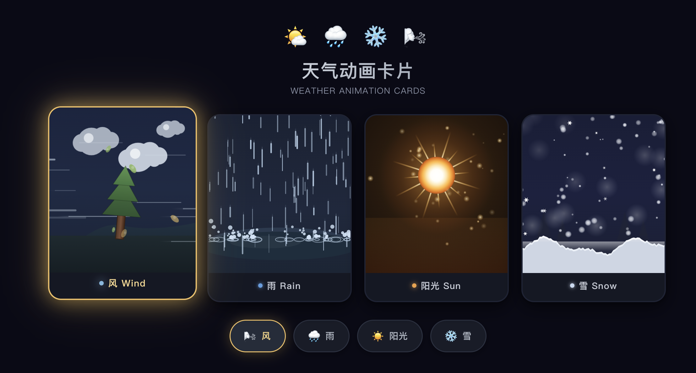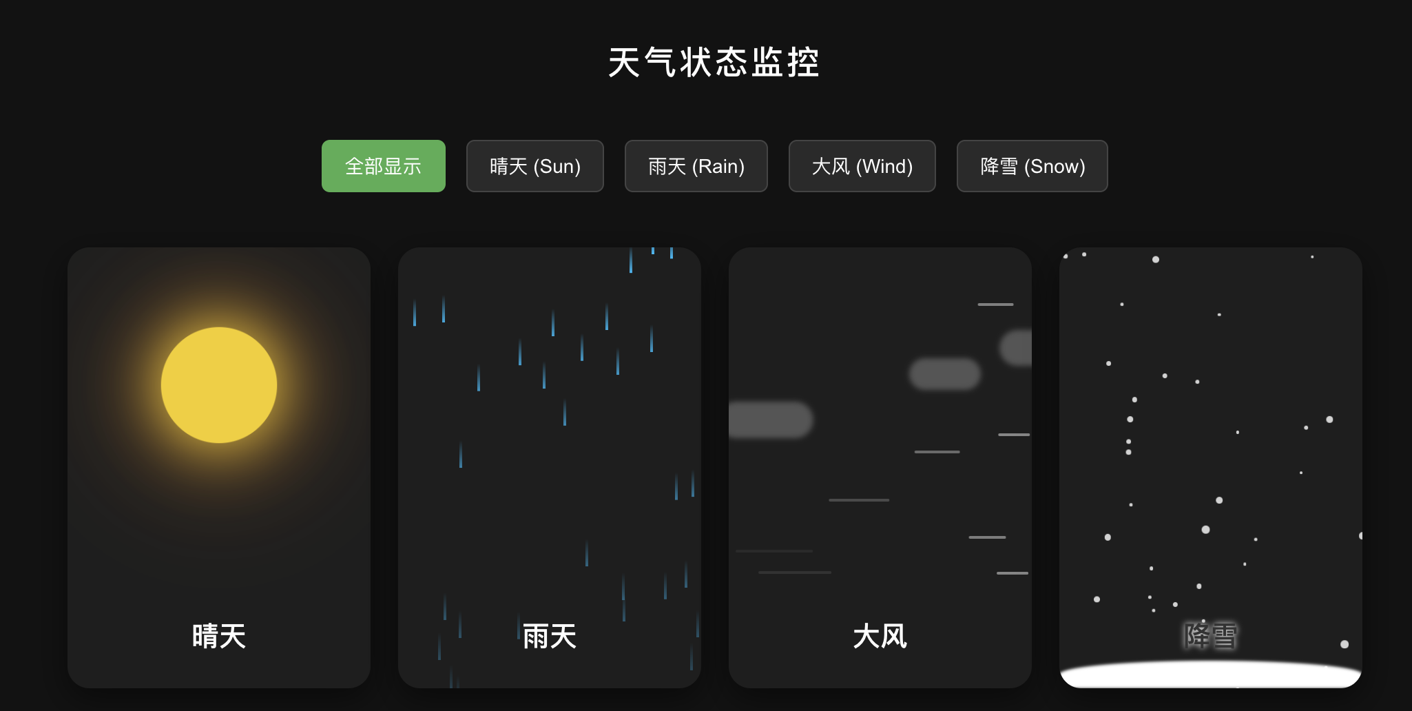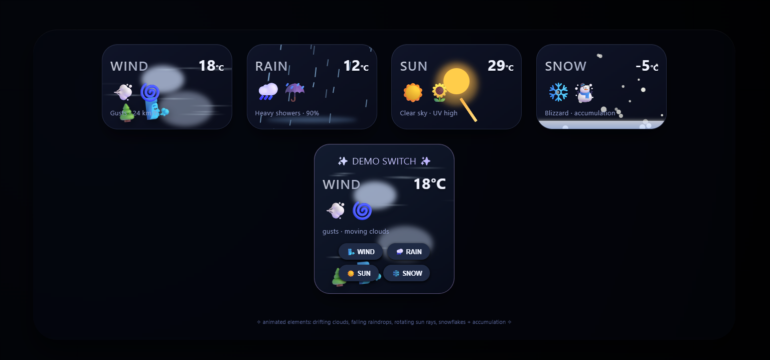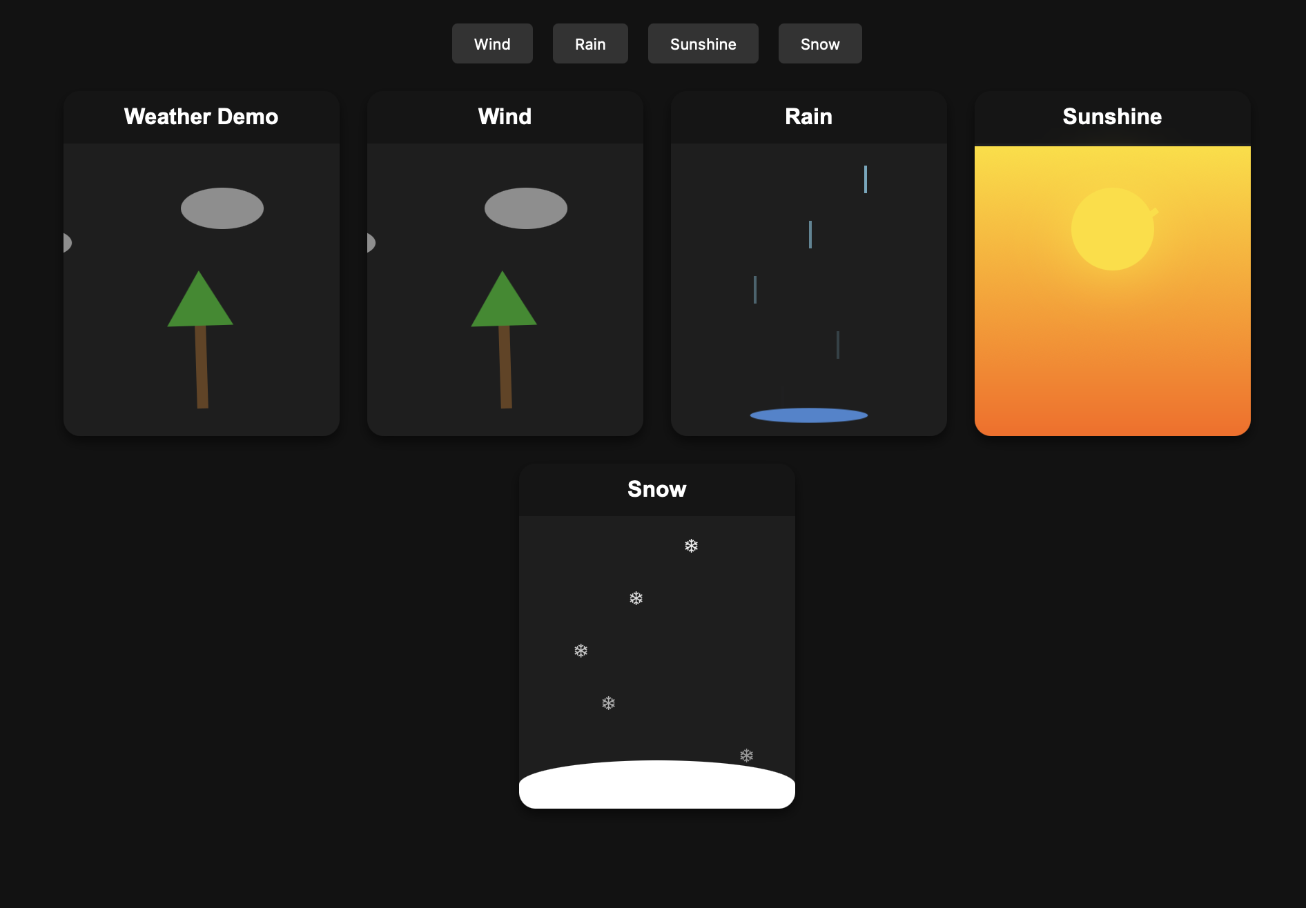 Create a single HTML file containing CSS and JavaScript to generate an animated weather card. The card should visually represent the following weather conditions with distinct animations: Wind: (e.g., moving clouds, swaying trees, or wind lines) Rain: (e.g., falling raindrops, puddles forming) Sun: (e.g., shining rays, bright background) Snow: (e.g., falling snowflakes, snow accumulating) Show all the weather card side by side The card should have a dark background. Provide all the HTML, CSS, and JavaScript code within this single file. The JavaScript should include a way to switch between the different weather conditions (e.g., a function or a set of buttons) to demonstrate the animations for each.